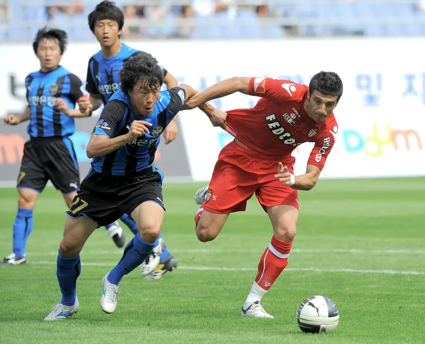 Niculae Daniel (R) of AS Monaco vies for the ball with An Jae-Jun (L) of Incheon United during their friendly match in Incheon on July 11, 2010. AS Monaco and Incheon United finished in a 2-2 draw. AFP PHOTO / PARK JI-HWAN