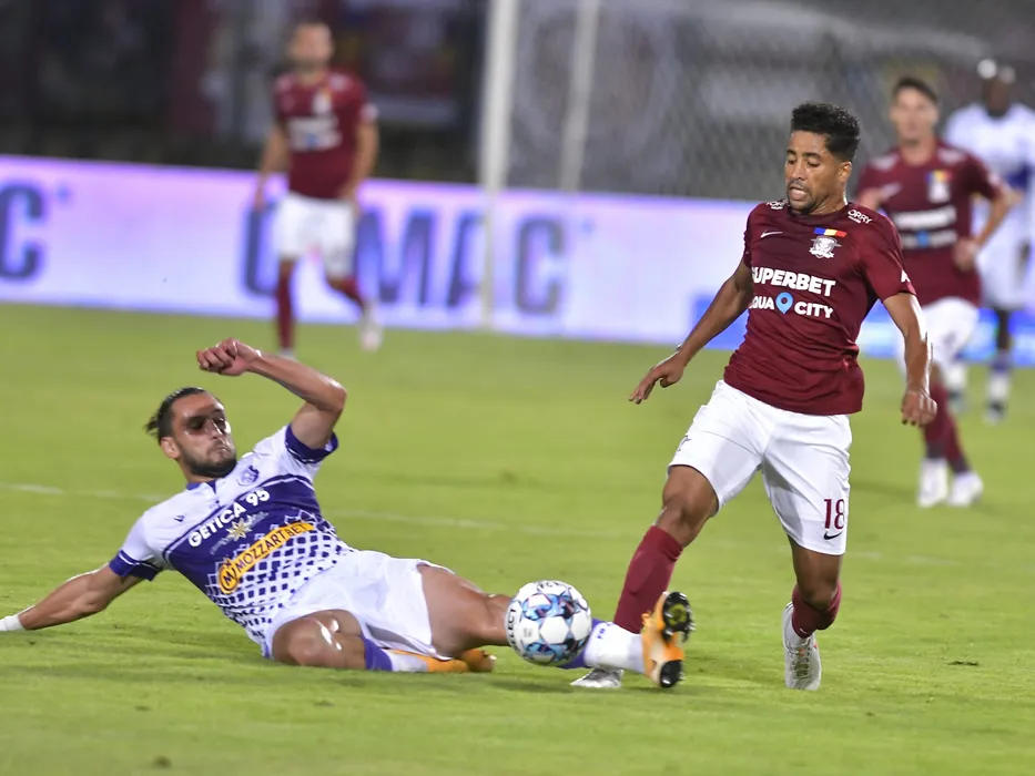 Deian Boldor si Saiffedine Alami Bazza in meciul de fotbal dintre FC Arges si Rapid Bucuresti, contand pentru Liga 1 Casa Pariurilor, desfasurat pe Stadionul Nicolae Dobrin din Pitesti, sambata 7 august 2021. © FOTO:Razvan Pasarica/SPORT PICTURES