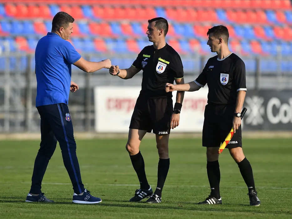Daniel Oprita ii saluta pe arbitrii Madalin Dicu si Constantin Pantilimonescu dupa meciul de fotbal dintre CSA Steaua Bucuresti si CS Balotesti, contand pentru Cupa Romaniei, disputat fara spectatori pe Terenul nr. 5 din cadrul Comlexului Sportiv Ghencea din Bucuresti, miercuri 9 septembrie 2020. © FOTO:Razvan Pasarica/SPORT PICTURES