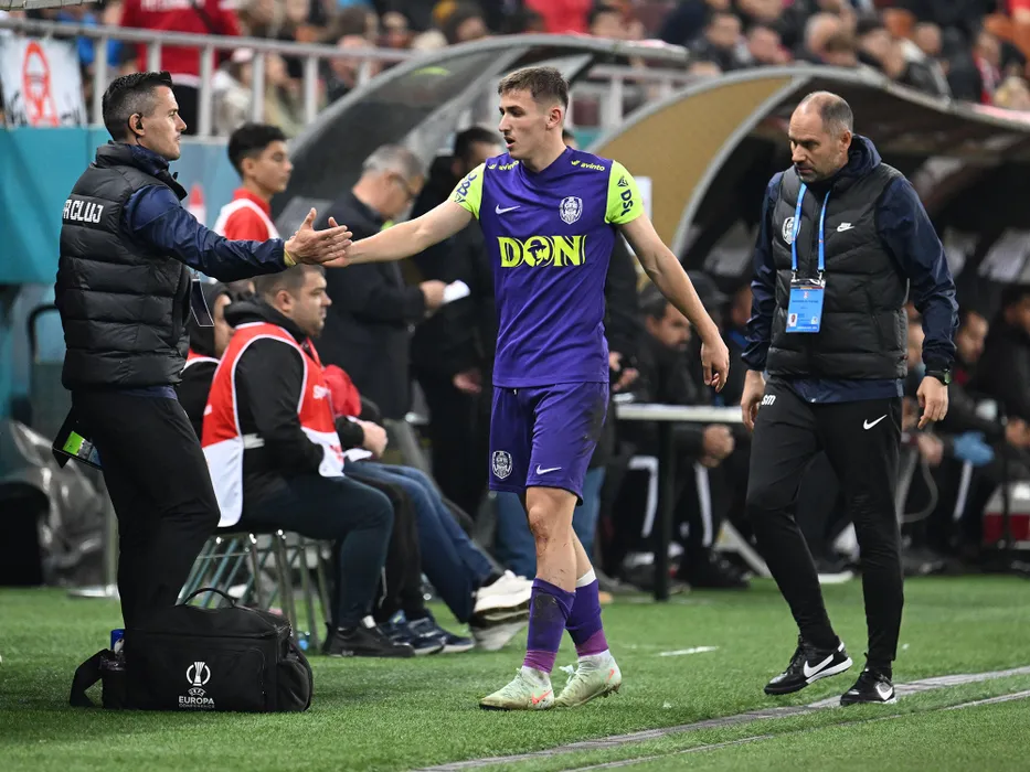 Lindon Emerllahu felicitat la iesirea de pe teren de catre Laurentiu Rus din meciul de fotbal dintre Dinamo Bucuresti si CFR Cluj, din cadrul Superligii Superbet, desfasurat pe Arena Nationala din Bucuresti, vineri 31 octombrie 2025. © FOTO:Razvan Pasarica/SPORT PICTURES