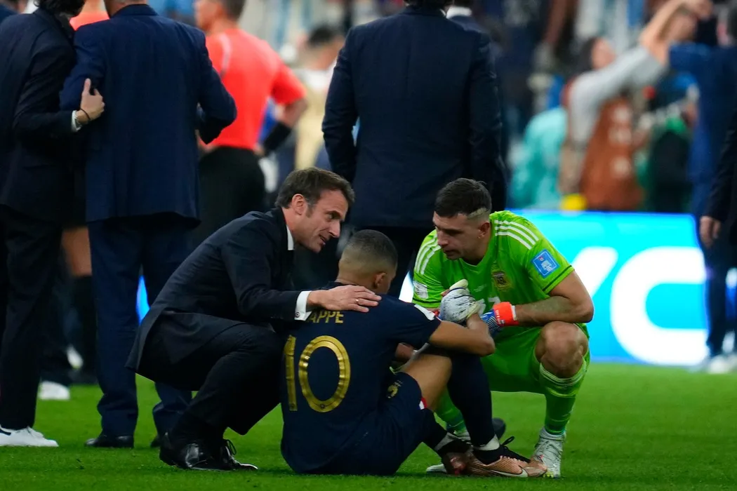 France's President Emmanuel Macron and goalkeeper Emiliano Martinez confort France's Kylian Mbappe at the end of the World Cup final soccer match between Argentina and France at the Lusail Stadium in Lusail, Qatar, Sunday, Dec. 18, 2022.,Image: 745401980, License: Rights-managed, Restrictions: This content is intended for editorial use only. For other uses, additional clearances may be required., Model Release: no, Pictured: Damian Martinez,Emmanuel Macron,Kylian Mbappe Lottin