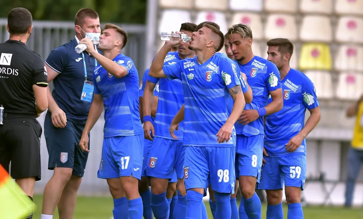 Fotbalistii targovisteni Marian Cristinel Serban, Tiberiu Ionut Capusa, Marco Alexandru Dulca si Doru Popadiuc la o pauza de hidratare in meciul de fotbal dintre Chindia Targoviste si Farul Constanta, contand pentru Liga 1 Casa Pariurilor, desfasurat pe Stadionul Ilie Oana din Ploiesti, sambata 18 septembrie 2021. © FOTO:Razvan Pasarica/SPORT PICTURES