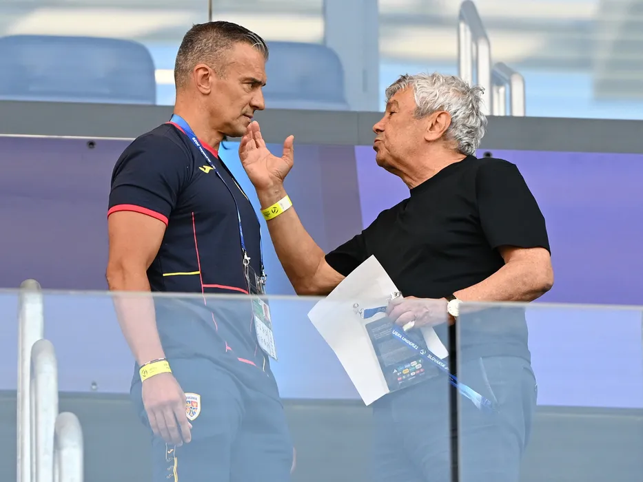 Daniel Pancu si Mircea Lucescu discuta inaintea meciului de fotbal dintre Spania U21 si Romania U21, din cadrul UEFA EURO U21 din Slovacia, desfasurat pe Stadionul National de fotbal din Bratislava, sambata 14 iunie 2025. © FOTO:Razvan Pasarica/SPORT PICTURES