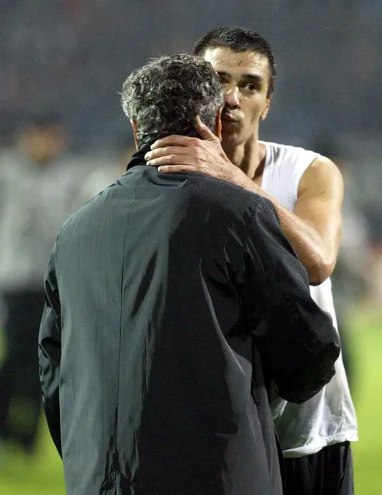 Besiktas`s Romanian forward Gabriel Pancu, right, kisses coach Mircea Lucescu after during their Champions League Group G match at Inonu Stadium in Istanbul November 4, 2003.