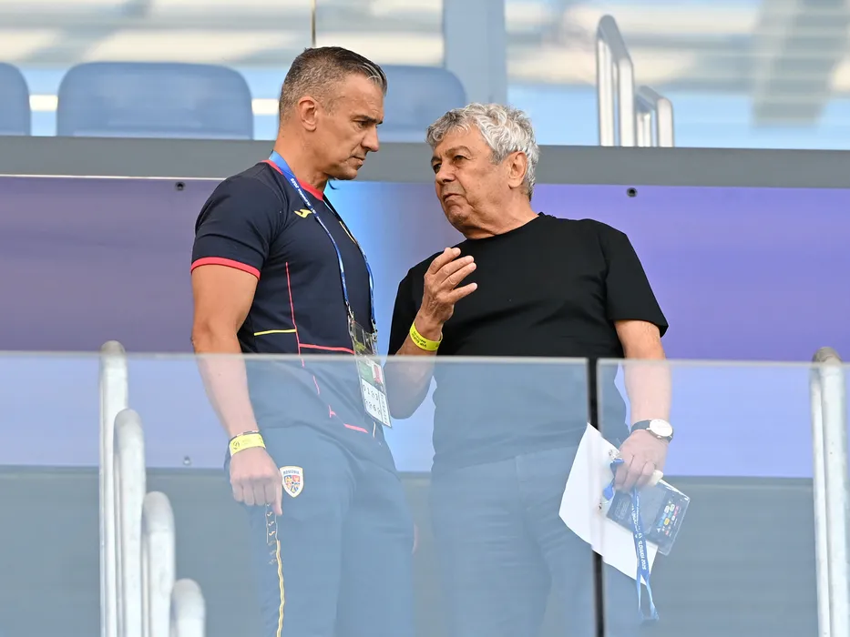 Daniel Pancu si Mircea Lucescu discuta inaintea meciului de fotbal dintre Spania U21 si Romania U21, din cadrul UEFA EURO U21 din Slovacia, desfasurat pe Stadionul National de fotbal din Bratislava, sambata 14 iunie 2025. © FOTO:Razvan Pasarica/SPORT PICTURES