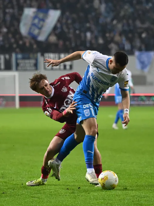 Carlos Andrei Mora Montoya si Lorenzo Biliboc in meciul de fotbal dintre Universitatea Craiova si CFR Cluj, contand pentru Cupa Romaniei Betano, desfasurat pe Stadionul Ion Oblemenco din Craiova, miercuri 4 martie 2026. © FOTO:Razvan Pasarica/SPORT PICTURES