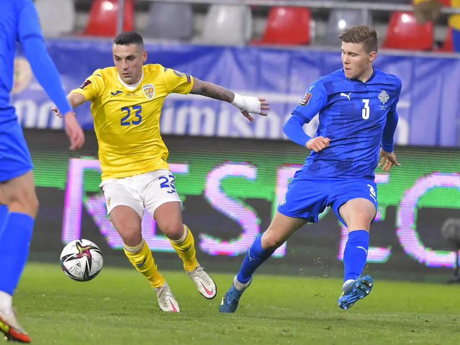 Nicolae Stanciu si Alfons Sampsted in meciul de fotbal dintre Romania si Islanda, din cadrul Preliminariilor Campionatului Mondial 2022, desfasurat pe Stadionul Steaua din Bucuresti, joi 11 noiembrie 2021. © FOTO:Razvan Pasarica/SPORT PICTURES