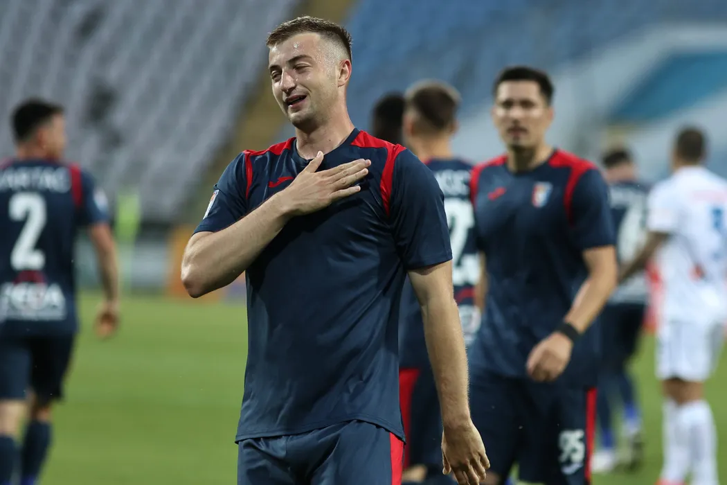 Iliuta Daniel Popa se bucura dupa un gol marcat in meciul de fotbal dintre Chindia Targoviste si Viitorul Constanta, contand pentru Barajul semifinala Confrence League, desfasurat pe Stadionul Gloria din Buzau, joi 27 mai 2021. © FOTO:Gheorghe Fluster/SPORT PICTURES