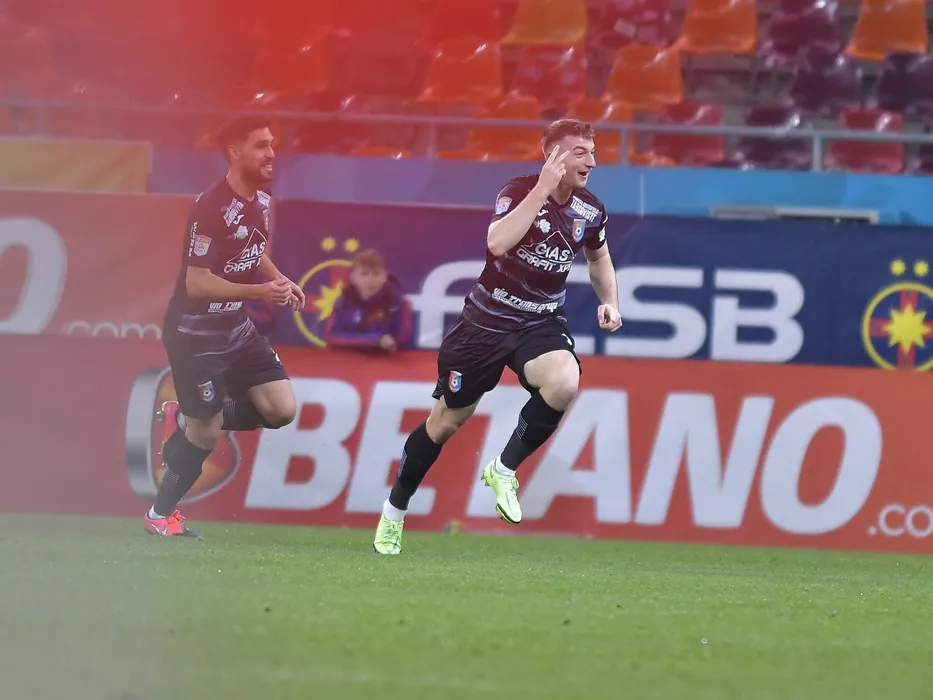 Iliuta Daniel Popa se bucura dupa un gol marcat alaturi de Juan Pablo Passaglia in meciul de fotbal dintre FCSB si Chindia Targoviste, contand pentru Liga 1 Casa Pariurilor, desfasurat pe Arena Nationala din Bucuresti, duminica 13 februarie 2022. © FOTO:Razvan Pasarica/SPORT PICTURES