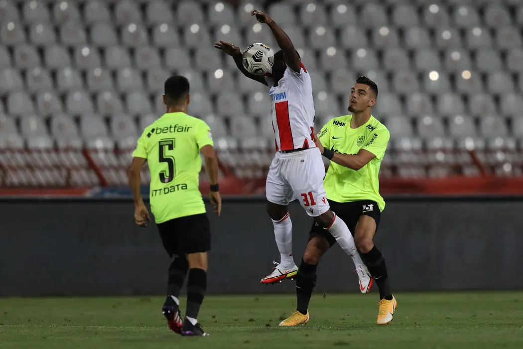 Denis Ciobotariu (D), de la CFR Cluj, lupta pentru balon cu El Fardou Ben Nabouhane (C), de la Steaua Rosie Belgrad, in meciul de fotbal din turul play-off-ului Europa League, disputat pe stadionul Rajko Mitic din Belgrad, marti, 17 august 2021. CIPRIAN PETCUT / MEDIAFAX FOTO