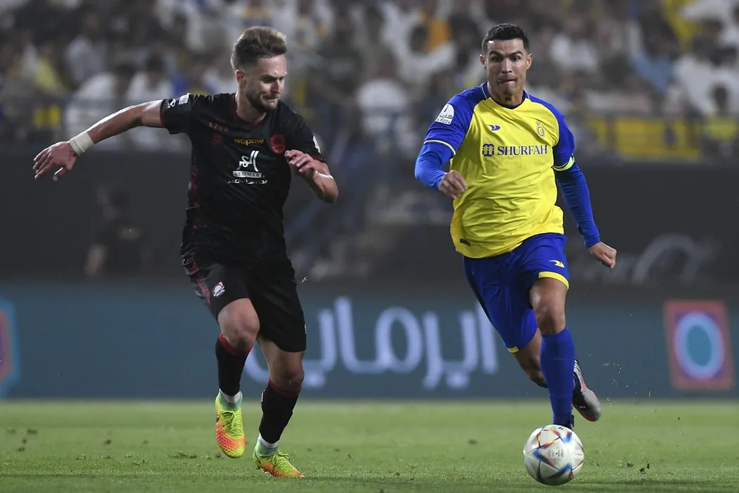 Nassr's Portuguese forward Cristiano Ronaldo (R) is marked by Raed's Croatian midfielder Damjan Djokovic the Saudi Pro League football match between Al-Nassr and Al-Raed at the al-Awwal Park Stadium in the Saudi capital Riyadh on April 28, 2023.,Image: 772644915, License: Rights-managed, Restrictions: , Model Release: no