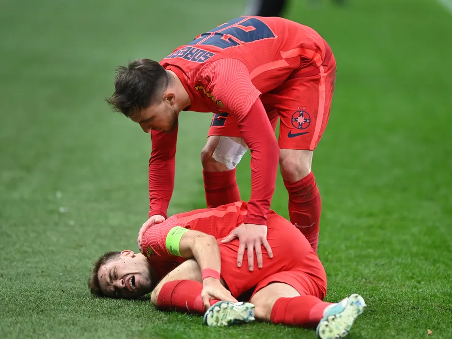 Deian Cristian Sorescu alaturi de Darius Dumitru Olaru aflat la pamant accidentat in meciul de fotbal dintre FCSB si Sepsi OSK Sfantu Gheorghe, contand pentru Superliga Superbet, desfasurat pe Arena Nationala din Bucuresti, duminica 12 martie 2023. © FOTO:Razvan Pasarica/SPORT PICTURES