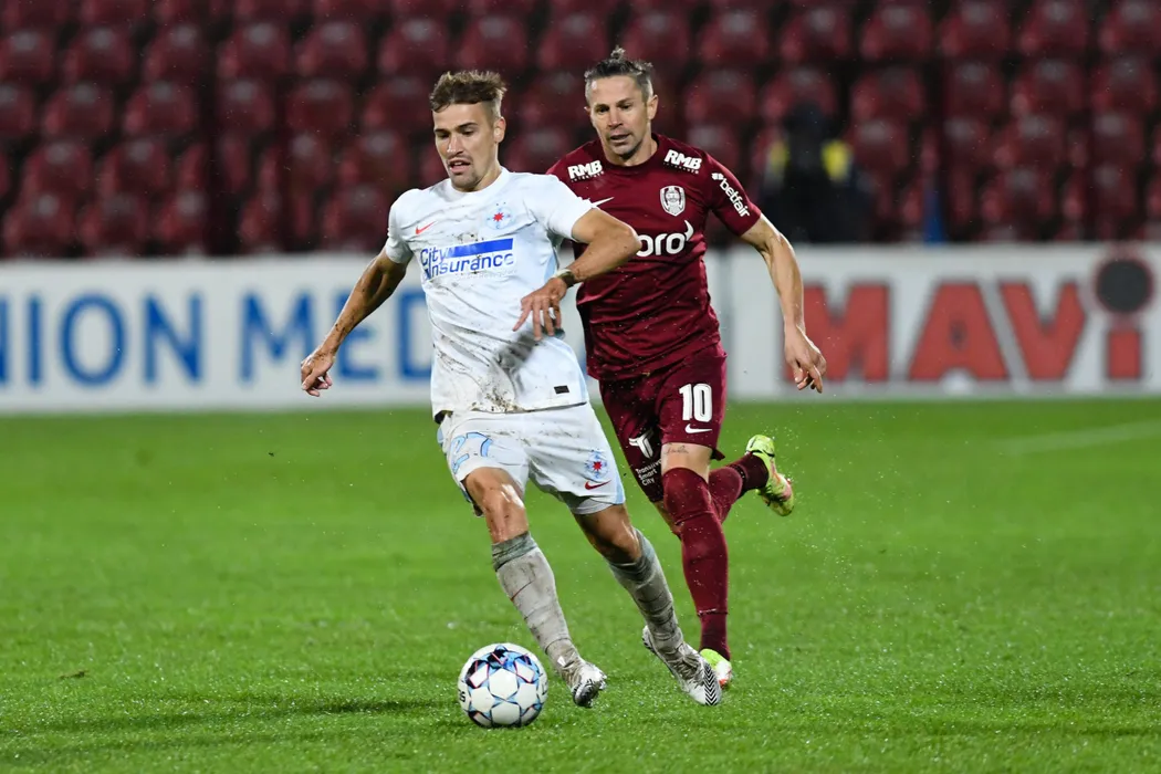Ciprian Deac (D), de la CFR Cluj, lupta pentru balon cu Darius Olaru (S), de la FCSB, in meciul de fotbal din etapa a VII-a a Ligii 1, disputat pe stadionul Dr. Constantin Radulescu, duminica, 29 august 2021. FLAVIU BUBOI / MEDIAFAX FOTO