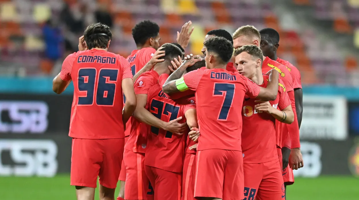 Bucurie a fotbalistilor stelisti Florinel Teodor Coman si Grigoras Alexandru Pantea dupa un gol marcat in meciul de fotbal dintre FCSB si UTA Arad, contand pentru Superliga Superbet, desfasurat pe Arena Nationala din Bucuresti, duminica 16 octombrie 2022. © FOTO:Razvan Pasarica/SPORT PICTURES