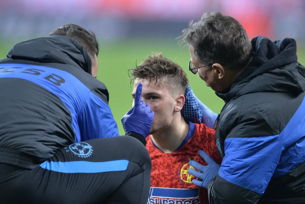 Darius Olaru (C), de la FCSB, primeste ingrijiri medicale, dupa ce s-a accidentat in timpul meciului de fotbal contra echipei Universitatea Craiova, din etapa a II-a a play-off-ului Ligii 1, disputat pe Arena Nationala din Bucuresti, duminica, 8 martie 2020. ALEXANDRU DOBRE / MEDIAFAX FOTO