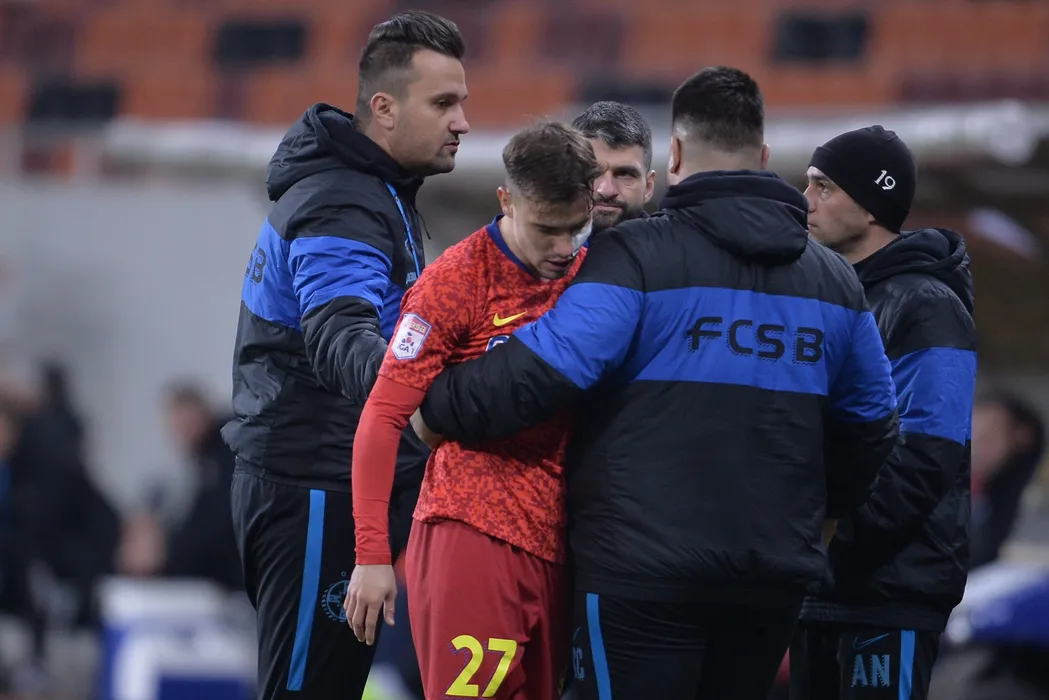 Darius Olaru (C), de la FCSB, primeste ingrijiri medicale, dupa ce s-a accidentat in timpul meciului de fotbal contra echipei Universitatea Craiova, din etapa a II-a a play-off-ului Ligii 1, disputat pe Arena Nationala din Bucuresti, duminica, 8 martie 2020. ALEXANDRU DOBRE / MEDIAFAX FOTO