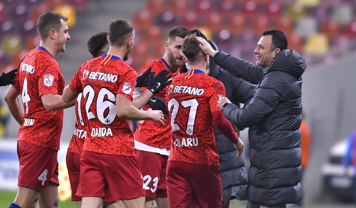 Toni Petrea il felicita pe Darius Dumitru Olaru alaturi de Andrei George Miron si Ovidiu Marian Popescu dupa un gol marcat in meciul de fotbal dintre FCSB si Chindia Targoviste, contand pentru Liga 1 Casa Pariurilor, desfasurat fara spectatori pe Arena Nationala din Bucuresti, sambata 20 februarie 2021. © FOTO:Razvan Pasarica/SPORT PICTURES