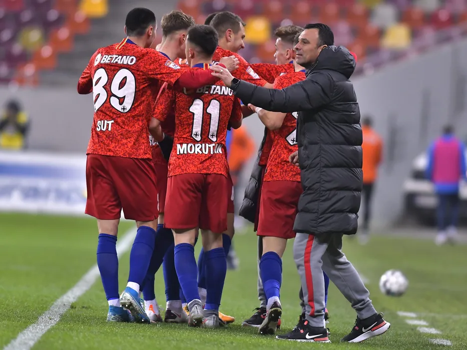 Toni Petrea se bucura alaturi de fotbalistii stelisti in meciul de fotbal dintre FCSB si Chindia Targoviste, contand pentru Liga 1 Casa Pariurilor, desfasurat fara spectatori pe Arena Nationala din Bucuresti, sambata 20 februarie 2021. © FOTO:Razvan Pasarica/SPORT PICTURES