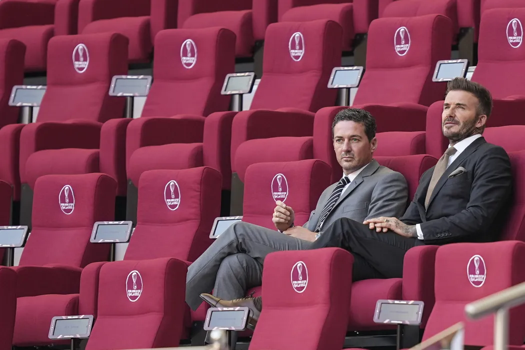 Former England's player and captain David Beckham, right, seats on a tribune before the start of the World Cup group B soccer match between England and Iran at the Khalifa International Stadium, in Doha, Qatar, Monday, Nov. 21, 2022. (AP Photo/Martin Meissner)