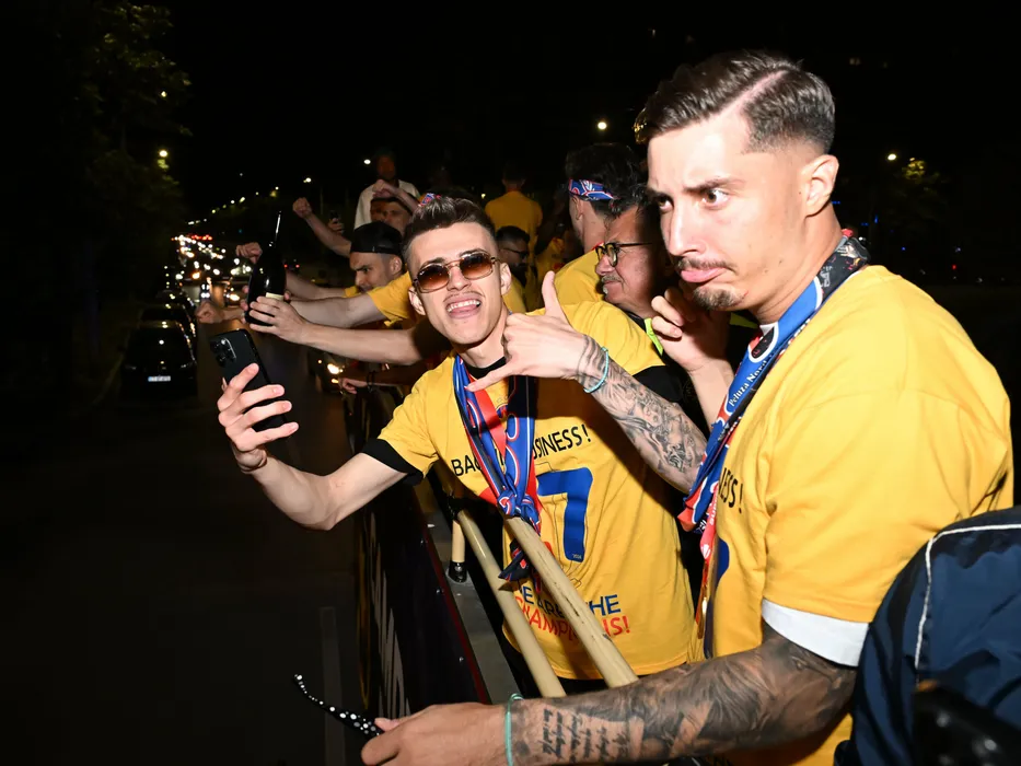 Fotbalistii stelisti Octavian George Popescu si David Raul Miculescu celebreaza castigarea Superligii intr-un autocar descoperit pe traseul Arena Nationala-Ateneul Roman din Bucuresti, sambata 11 mai 2024. © FOTO: Razvan Pasarica/SPORT PICTURES