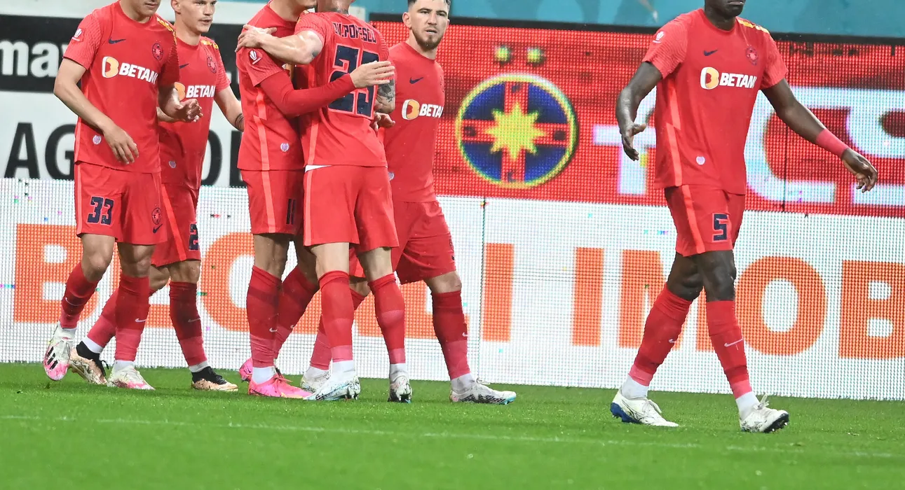 Bucurie a fotbalistilor stelisti dupa un gol marcat cu Joyskim Aurelien Dawa Tchakonte, Grigoras Alexandru Pantea, David Raul Miculescu, Ovidiu Marian Popescu si Risto Radunovic in meciul de fotbal dintre FCSB si Sepsi OSK Sfantu Gheorghe, contand pentru Play-off-ul Superligii Superbet, desfasurat pe Arena Nationala din Bucuresti, luni 8 mai 2023. © FOTO:Razvan Pasarica/SPORT PICTURES