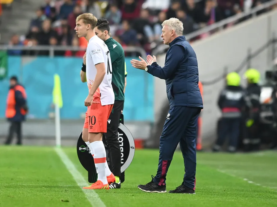 Kaelan Casey si David Moyes in meciul de fotbal dintre FCSB si West Ham United, din cadrul grupelor UEFA Europa Conference League, desfasurat pe Arena Nationala din Bucuresti, joi 3 noiembrie 2022. © FOTO:Razvan Pasarica/SPORT PICTURES