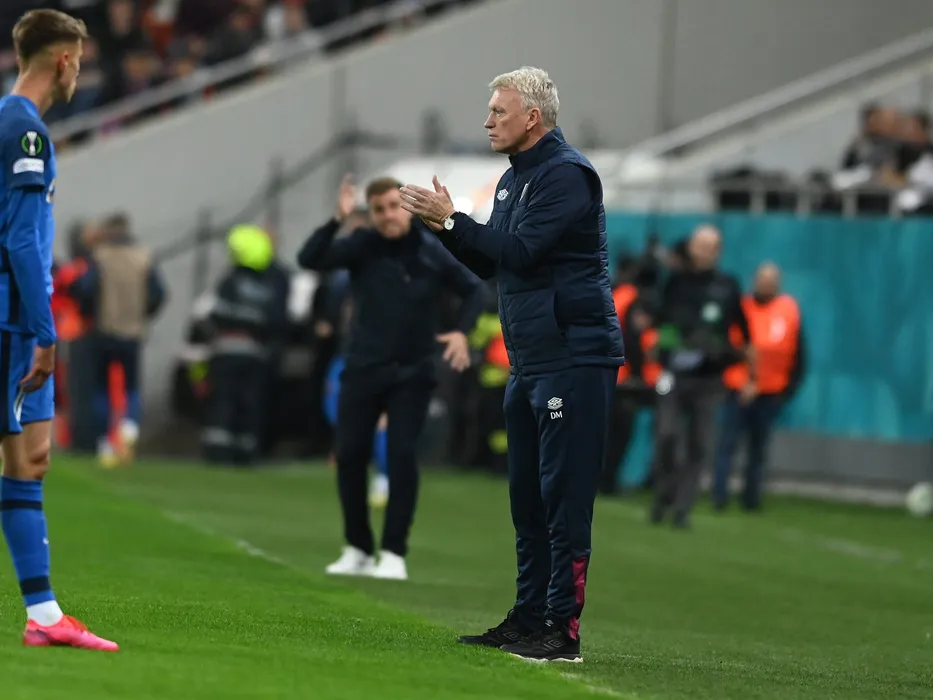 David Moyes reactioneaza in meciul de fotbal dintre FCSB si West Ham United, din cadrul grupelor UEFA Europa Conference League, desfasurat pe Arena Nationala din Bucuresti, joi 3 noiembrie 2022. © FOTO:Razvan Pasarica/SPORT PICTURES