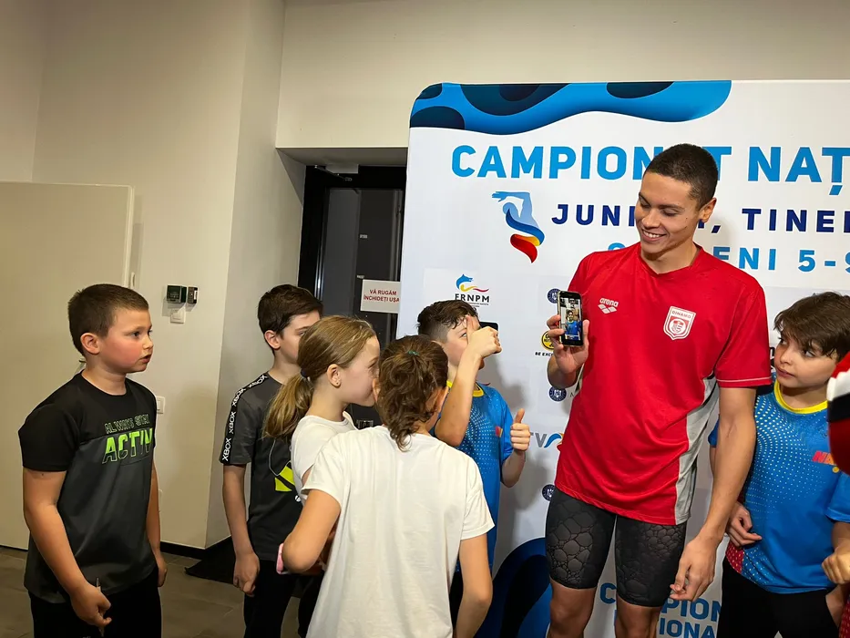David Popovici, asaltat de copii la Campionatele Naționale de Natație de la Otopeni! Cum își motivează colegii de la ștafetă: „E un lider!” | FOTO & VIDEO