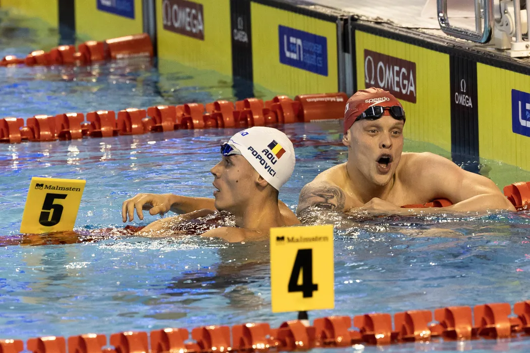 David Popovici și Guy James la Campionatele europene de înot în bazin scurt 2023, desfășurate la Complexul Sportiv de Natație din Otopeni, vinerii 8 decembrie 2023. © FOTO: Mihai NEACȘU/SPORT PICTURES