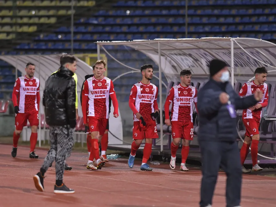Fotbalistii dinamovisti Balthazar Jean Phillipe Marie Pierret, Antonio Alexandru Bordusanu, Gabriel Andrei Torje si Ahmed Andrei Mustafa Bani parasesc tristi terenul dupa meciul de fotbal dintre FC Arges si Dinamo Bucuresti, contand pentru Liga 1 Casa Pariurilor, desfasurat pe Stadionul Nicolae Dobrin din Pitesti, vineri 21 ianuarie 2022. © FOTO:Razvan Pasarica/SPORT PICTURES