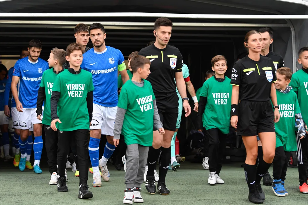 Brigada de arbitri formată din Ana Maria Terteleac, Daniel Ștefan și Gabriel Neagu și echipele intră pe teren în meciul de fotbal dintre CS Sănătatea Servicii Publice Cluj și FC Farul Constanța, contând pentru Cupa României Betano, desfășurat pe Stadionul Cluj Arena din Cluj-Napoca, miercuri 31 octombrie 2024. © FOTO: Flaviu BUBOI/SPORT PICTURES