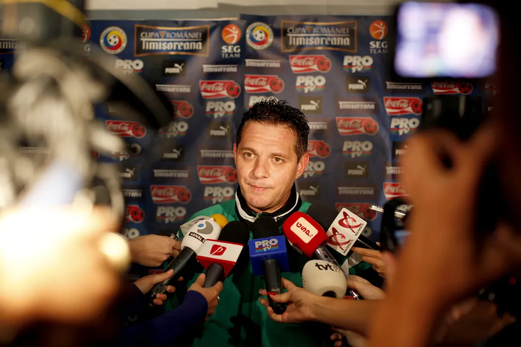 Patronul echipei Sanatatea Cluj, Aurelian Ghisa, sustine o conferinta de presa, la finalul meciului cu FC Timisoara, din cadrul saisprezecimilor de finala ale Cupei Romaniei-Timisoreana la fotbal, disputat in Timisoara, marti, 23 septembrie 2009. Echipa FC Timisoara s-a calificat in optimile de finala ale Cupei Romaniei-Timisoreana, dupa ce a invins, pe teren propriu, cu scorul de 7-0 (2-0), formatia din liga a III-a Sanatatea Cluj. ALEXANDRU HRENIUC / MEDIAFAX FOTO