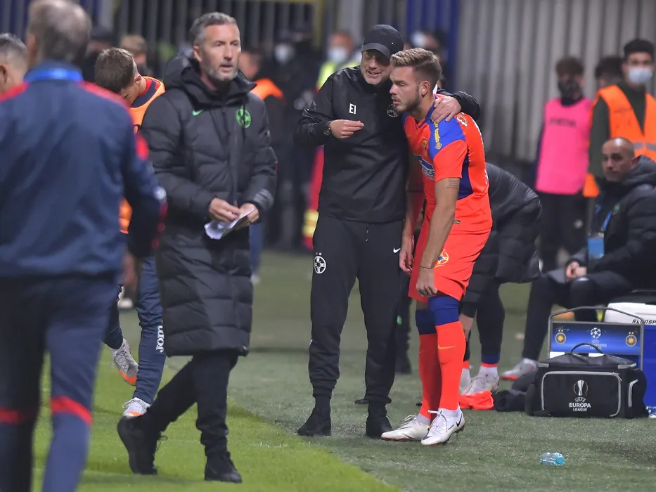 Edward Iordanescu discuta cu Denis Gratian Harut la schimbare in meciul de fotbal dintre Chindia Targoviste si FCSB, contand pentru Liga 1 Casa Pariurilor, desfasurat pe Stadionul Ilie Oana din Ploiesti, vineri 1 octombrie 2021. © FOTO:Razvan Pasarica/SPORT PICTURES