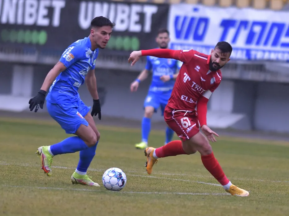 Marco Alexandru Dulca si Enriko Papa in meciul de fotbal dintre Chindia Targoviste si FC Botosani, contand pentru Liga 1 Casa Pariurilor, desfasurat pe Stadionul Ilie Oana din Ploiesti, sambata 20 februarie 2022. © FOTO:Razvan Pasarica/SPORT PICTURES