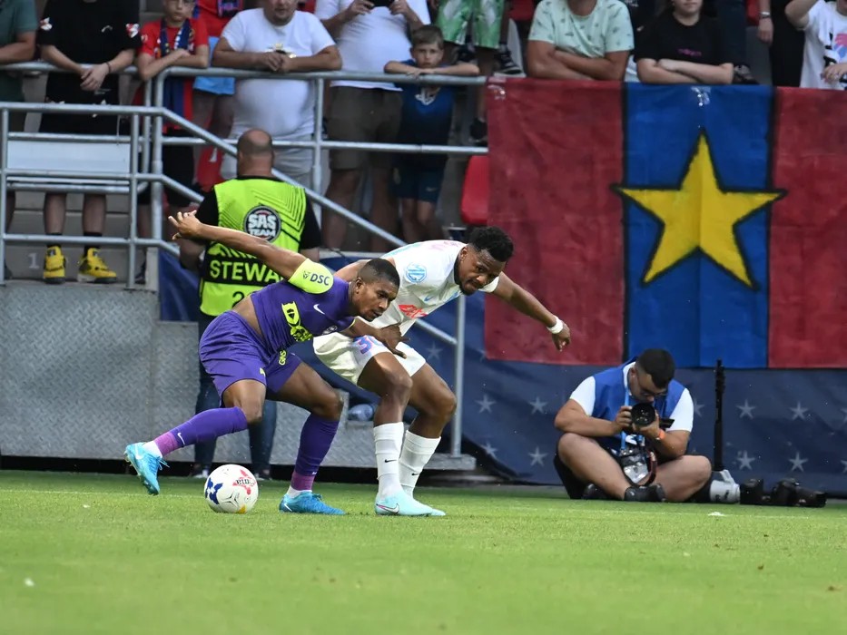 Mohammed Kesselly Kamara si Siyabonga Ngezana in meciul dintre FCSB si CFR Cluj, Supercupa Romaniei, desfasurat pe Stadionul Steaua-Ghencea din Bucuresti, sambata 5 iulie 2025. © FOTO:Razvan Pasarica/SPORT PICTURES