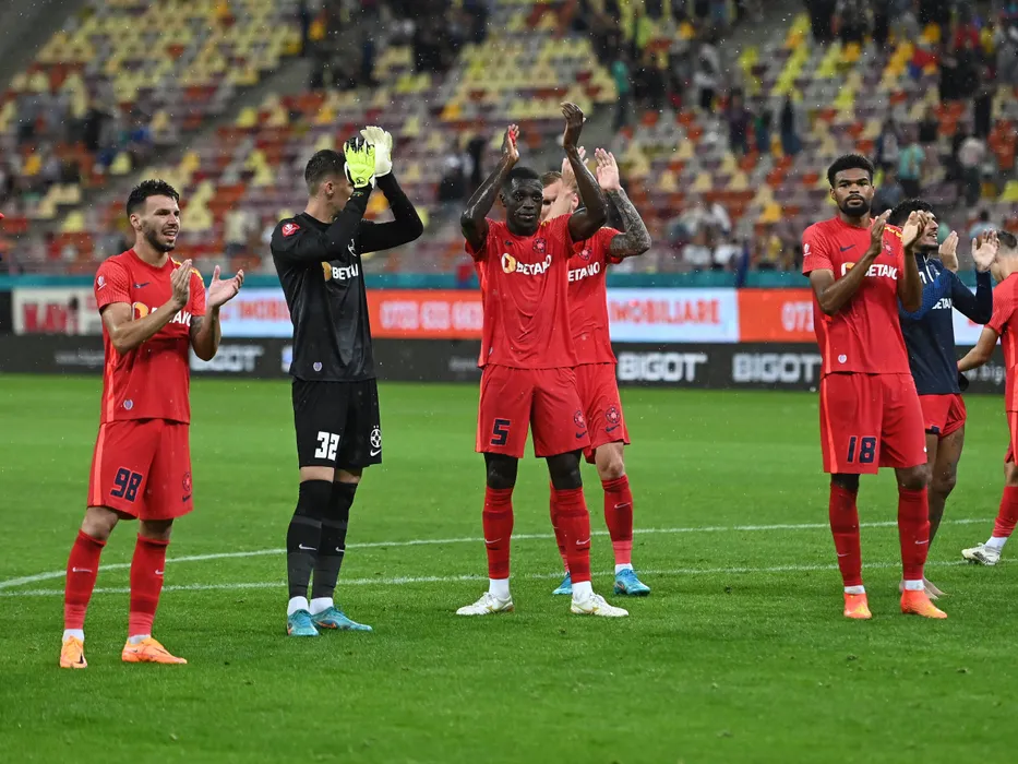 Fotbalistii stelisti Andrei Ioan Cordea, Joyskim Aurelien Dawa Tchakonte si Sylas Laouari Edjouma Malcom saluta galeria dupa meciul de fotbal dintre FCSB si Chindia Targoviste, contand pentru Superliga Superbet, desfasurat pe Arena Nationala din Bucuresti, duminica 14 august 2022. © FOTO:Razvan Pasarica/SPORT PICTURES