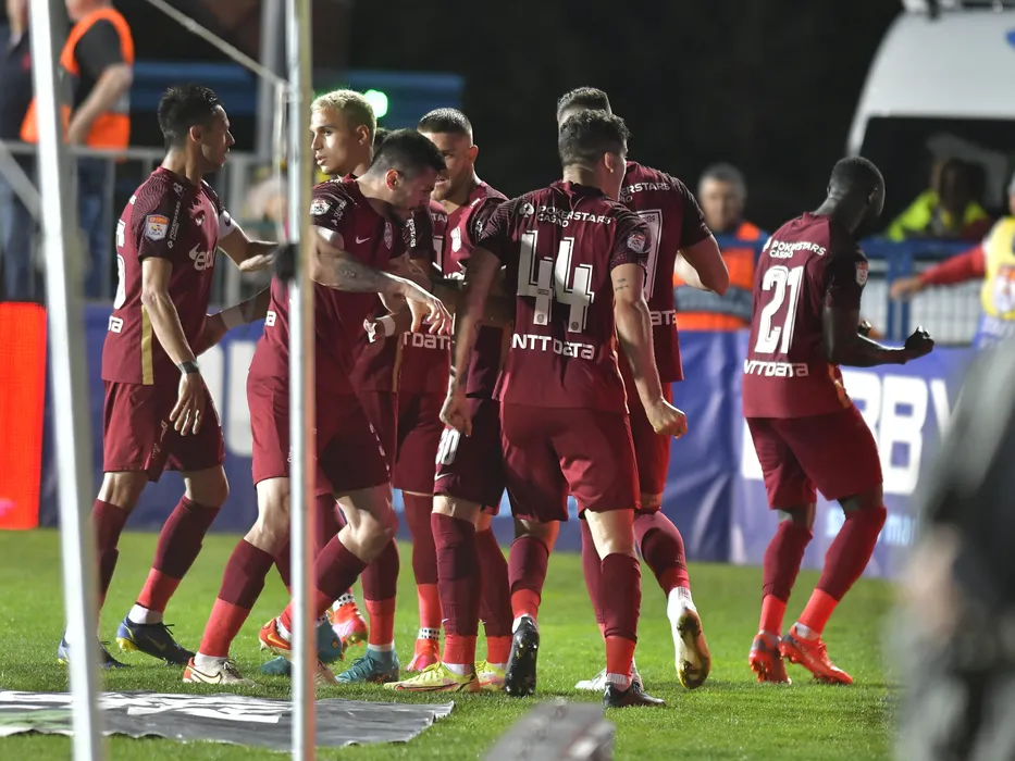 Bucurie a fotbalistilor clujeni dupa un gol marcat cu Mario Camora, Cristian Marian Manea, Andonie Andrei Burca si Bismark Adjei Boateng in meciul de fotbal dintre FC Voluntari si CFR Cluj, contand pentru Play-off-ul Ligii 1 Casa Pariurilor, desfasurat pe Stadionul Anghel Iordanescu din Voluntari, duminica 24 aprilie 2022. © FOTO:Razvan Pasarica/SPORT PICTURES
