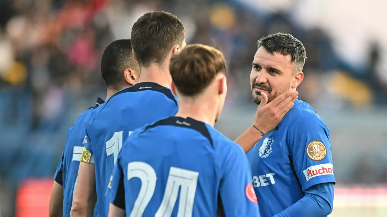 Constantin Valentin Budescu este felicitat dupa un gol marcat din penalty în meciul de fotbal dintre Farul Constanta si Otelul Galati, contând pentru Superliga Superbet, desfășurat pe Stadionul central al Academiei Gheorghe Hagi din Ovidiu, sambata 24 februarie 2024. © FOTO: Răzvan PĂSĂRICĂ/SPORT PICTURES