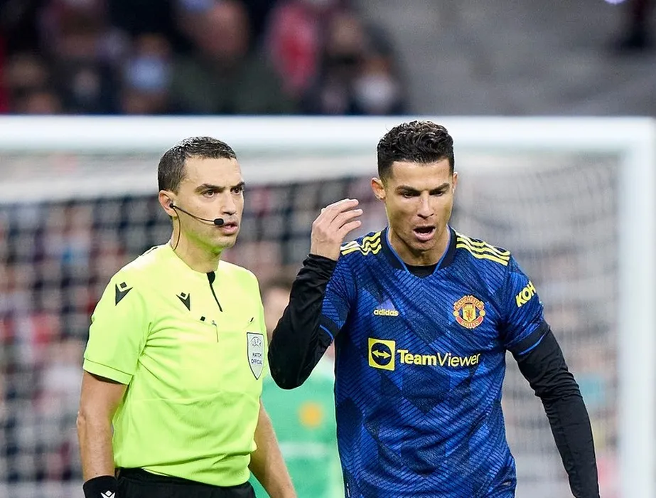 February 23, 2022, Madrid, Madrid, Spain: CRISTIANO RONALDO of Manchester United and referee Ovidiu Hategan during the Champions League football match between Atletico de Madrid and Manchester United at Wanda Metropolitano Stadium in Madrid, Spain, February 23, 2022,Image: 664552944, License: Rights-managed, Restrictions: , Model Release: no, Credit line: Profimedia
