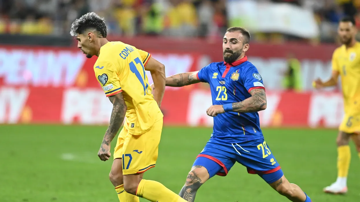 Florinel Coman si Jordi Rubio in meciul de fotbal dintre Romania si Andorra, din cadrul preliminariilor Campionatului European 2024, desfasurat pe Arena Nationala, duminica 15 octombrie 2023. © FOTO:Razvan Pasarica/SPORT PICTURES