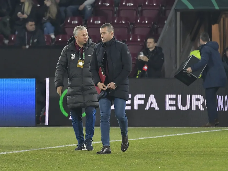 Dan Petrescu si Cristi Panin la meciul de fotbal dintre CFR Cluj si SS Lazio, din cadrul UEFA Europa Conference League, desfasurat pe Stadionul Dr. Constantin Radulescu din Cluj Napoca, joi 23 februarie 2023. © FOTO:Razvan Pasarica/SPORT PICTURES