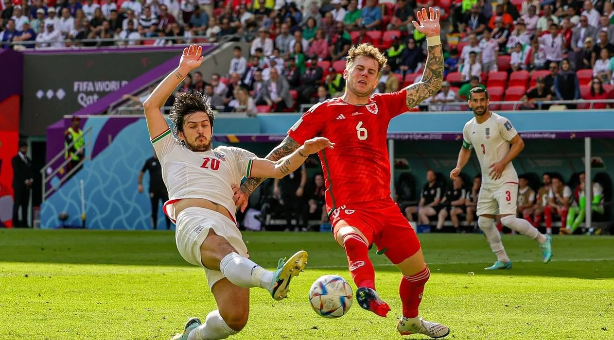 Sardar Azmoun (20) of Iran streches for the ball on goal defended by Joe Rodon (6) of Wales during the 2022 Fifa World Cup match between Wales and Iran at Ahmad bin Ali Stadium, Al Rayyan
