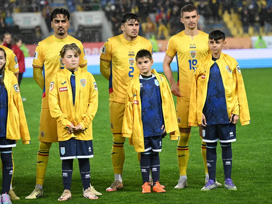 Fotbalistii romani Stefan Baiaram, Andrei Rațiu si Florin Tanase la startul meciului de fotbal dintre Romania si San Marino, din cadrul Preliminariilor Campionatului Mondial 2026, desfasurat pe Stadionul Ilie Oana din Ploiesti, marti 18 noiembrie 2025. © FOTO:Razvan Pasarica/SPORT PICTURES