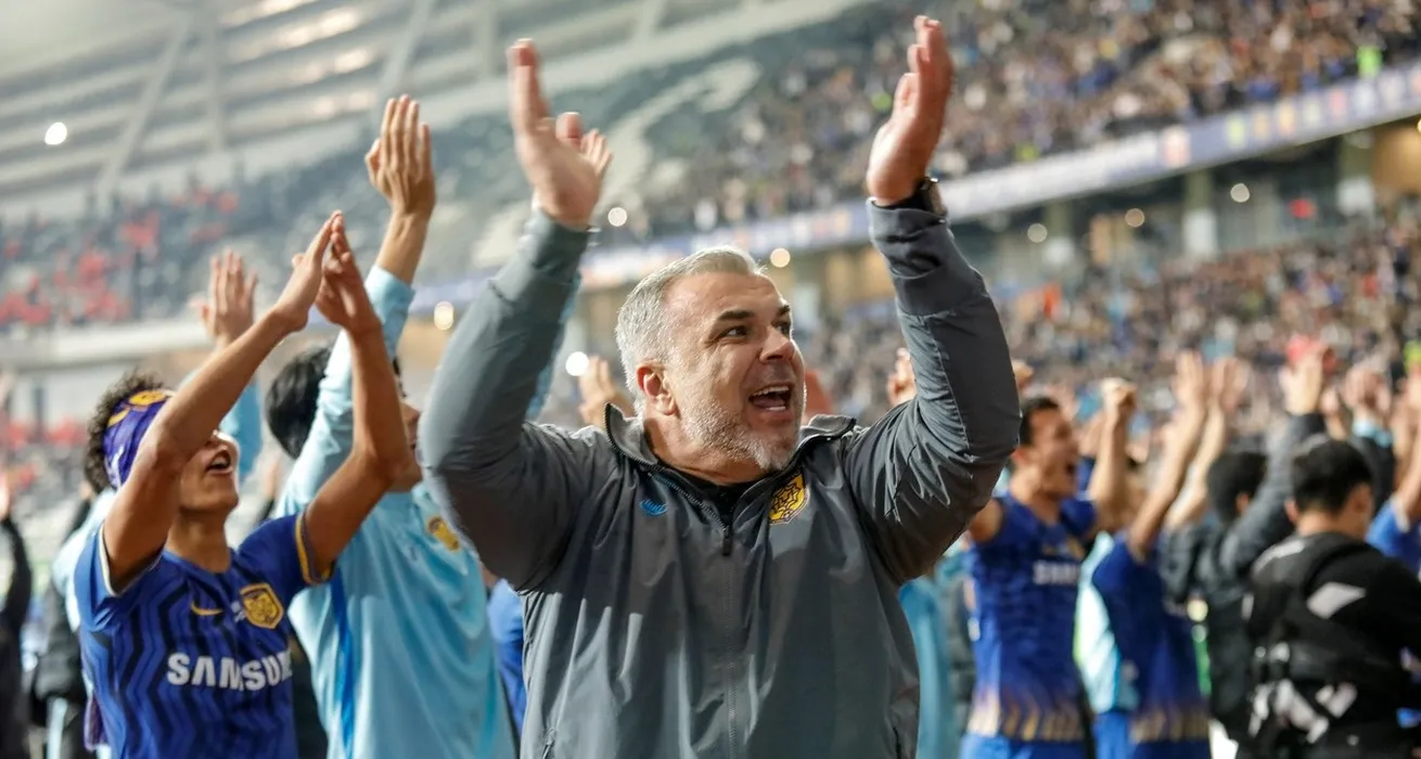 Jiangsu Suning's head coach Cosmin Olaroiu (C) celebrates after their team defeated Guangzhou Evergrande to win the Chinese Super League (CSL) football championship in Suzhou in China's eastern Jiangsu province on November 12, 2020.,Image: 568617988, License: Rights-managed, Restrictions: China OUT, Model Release: no