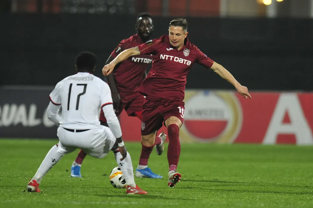 Formatiile CFR Cluj (echipament visiniu) si Rennes s-au intalnit, in partida retur din etapa a patra a grupelor Europa League la fotbal, joi 7 noiembrie 2019, la Cluj Npoca. DAN HORIA TAUTAN / MEDIAFAX FOTO
