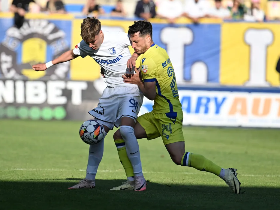 Luca Constantin Basceanu si Miranda Ricardo Jose Veiga Varzim (Ricardinho) in meciul de fotbal dintre Petrolul Ploiesti si Farul Constanta, din cadrul Play out-ul Superligii Superbet desfasurat pe Stadionul Ilie Oana din Ploiesti, luni 28 aprilie 2025. © FOTO:Razvan Pasarica/SPORT PICTURES