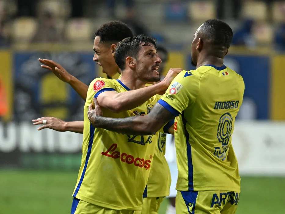 Fotbaliștii ploieșteni Yohan Cedric Benjamin Roche si Miranda Ricardo Jose Veiga Varzim (Ricardinho) îl felicită pe Okechukwu Christian Irobiso dupa un gol marcat in meciul de fotbal dintre Petrolul Ploiesti si Sepsi OSK Sfantu Gheorghe, din cadrul Play out-ul Superligii Superbet desfasurat pe Stadionul Ilie Oana din Ploiesti, vineri 4 aprilie 2025. © FOTO:Razvan Pasarica/SPORT PICTURES