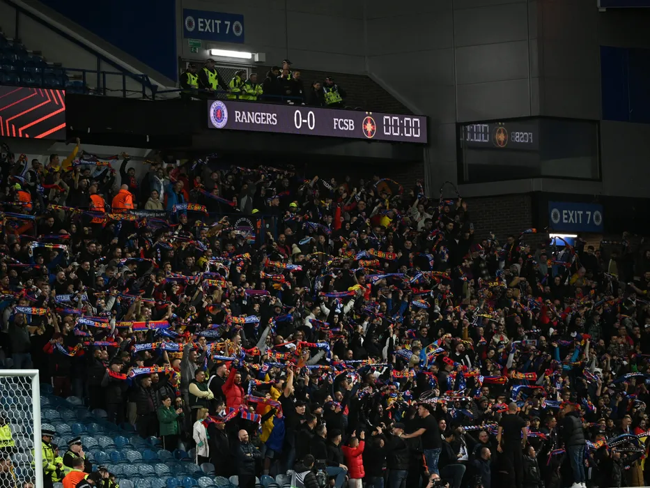 Suporterii din galeria stelista cu fularele si esarfele deasupra capetelor la meciul de fotbal dintre Glasgow Rangers si FCSB, din cadrul UEFA Europa League, desfasurat pe Stadionul Ibrox Park din Glasgow, joi 24 octombrie 2024. © FOTO:Razvan Pasarica/SPORT PICTURES