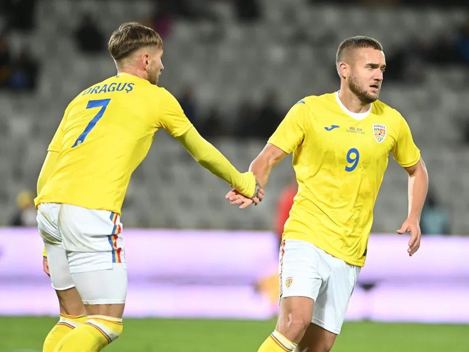 George Pușcaș il incurajeaza pe Denis Drăguș in meciul amical de fotbal dintre Romania si Slovenia, desfasurat pe Cluj Arena din Cluj Napoca, joi 17 noiembrie 2022. © FOTO:Razvan Pasarica/SPORT PICTURES