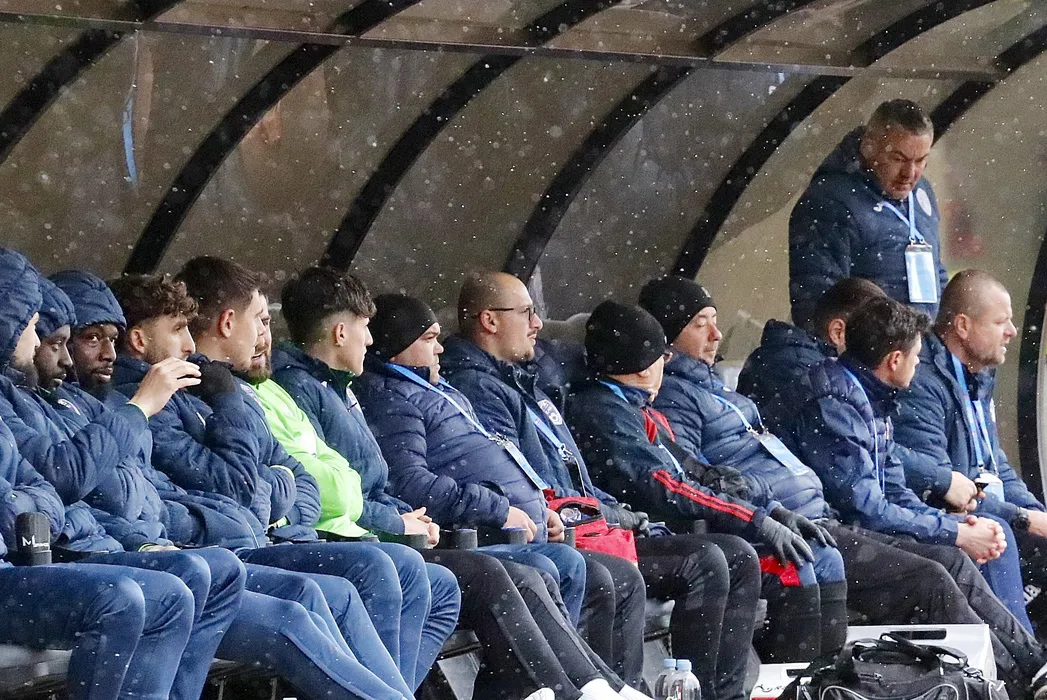 Ilie Stan si banca de rezerve buzoiana in meciul de fotbal dintre AFC Hermannstadt Sibiu si Gloria Buzau, contand petru Superliga Superbet - Play-Out, desfasurat pe Stadionul Municipal din Sibiu, duminica 6 aprilie 2025. © FOTO: Valentin Macrea/SPORT PICTURES